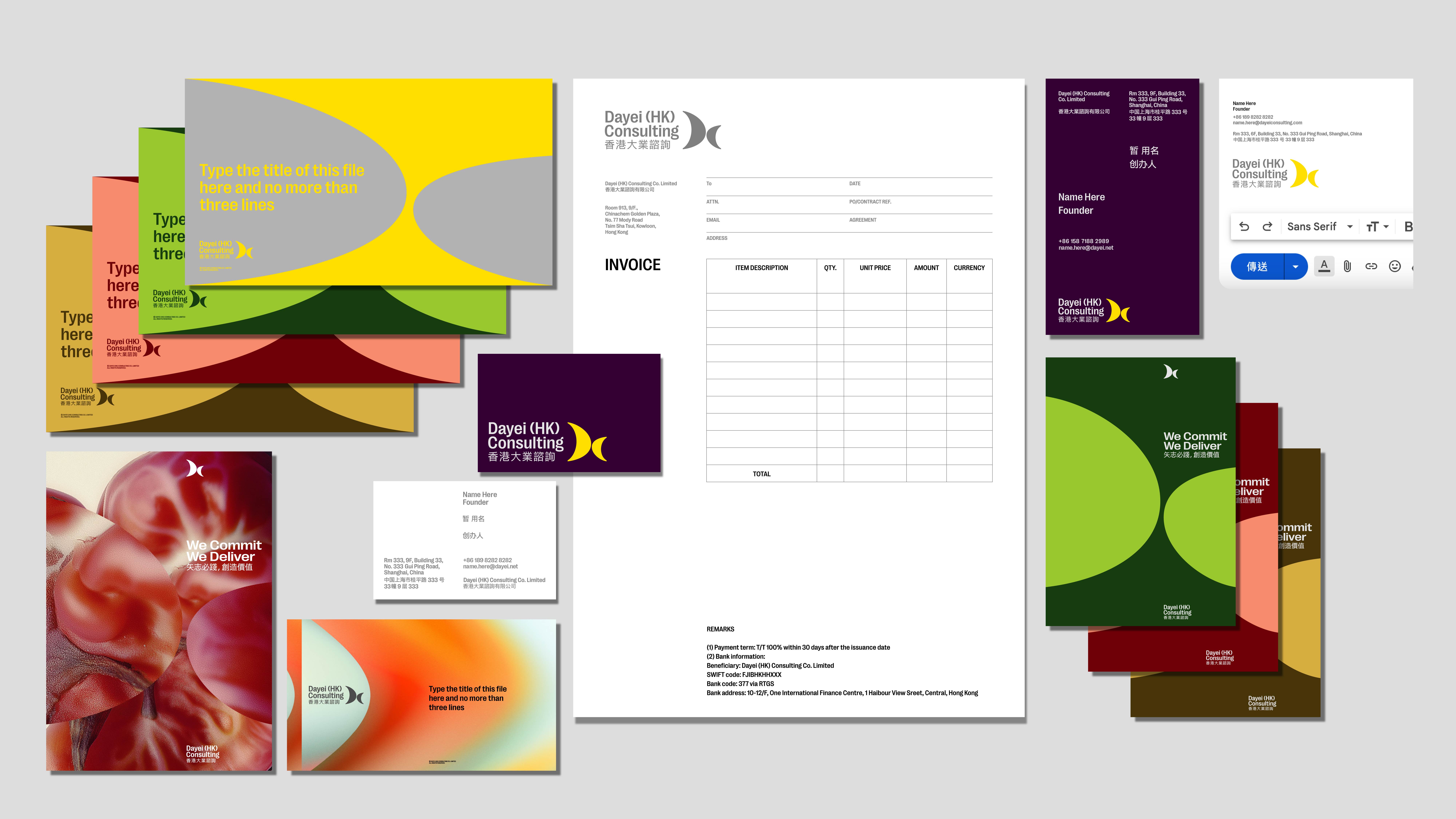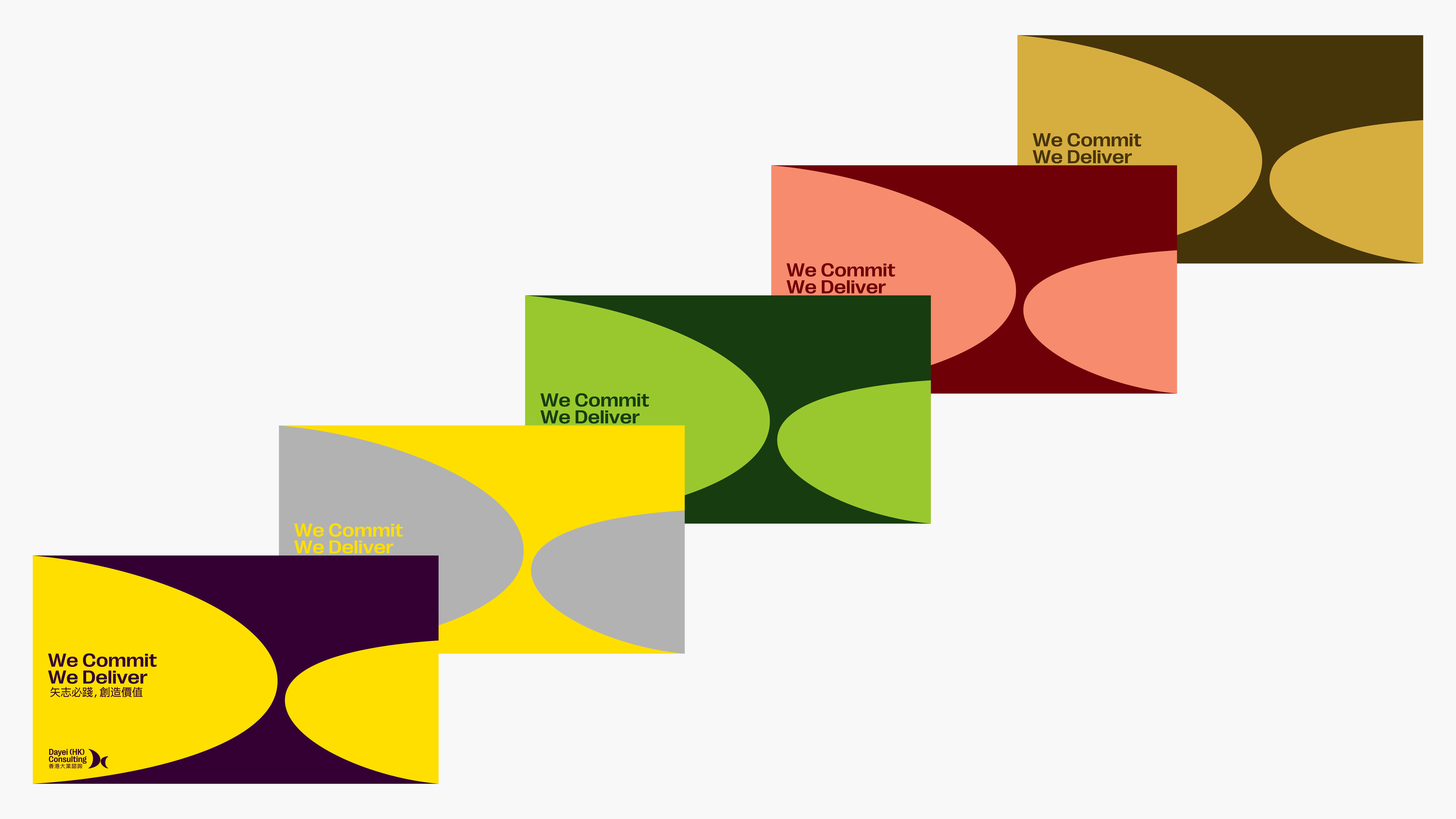 We drew on the core "collaboration" and "cooperation" relationships between Dayei and its partners as the foundation of the visual concept. We used the letters "D" and "C," both found in the company name "Dayei Consulting" and its tagline "We Commit, We Deliver," to represent Dayei's professional practices in a symbolic language as its brand identity, and together pairing with customized bilingual wordmarks.