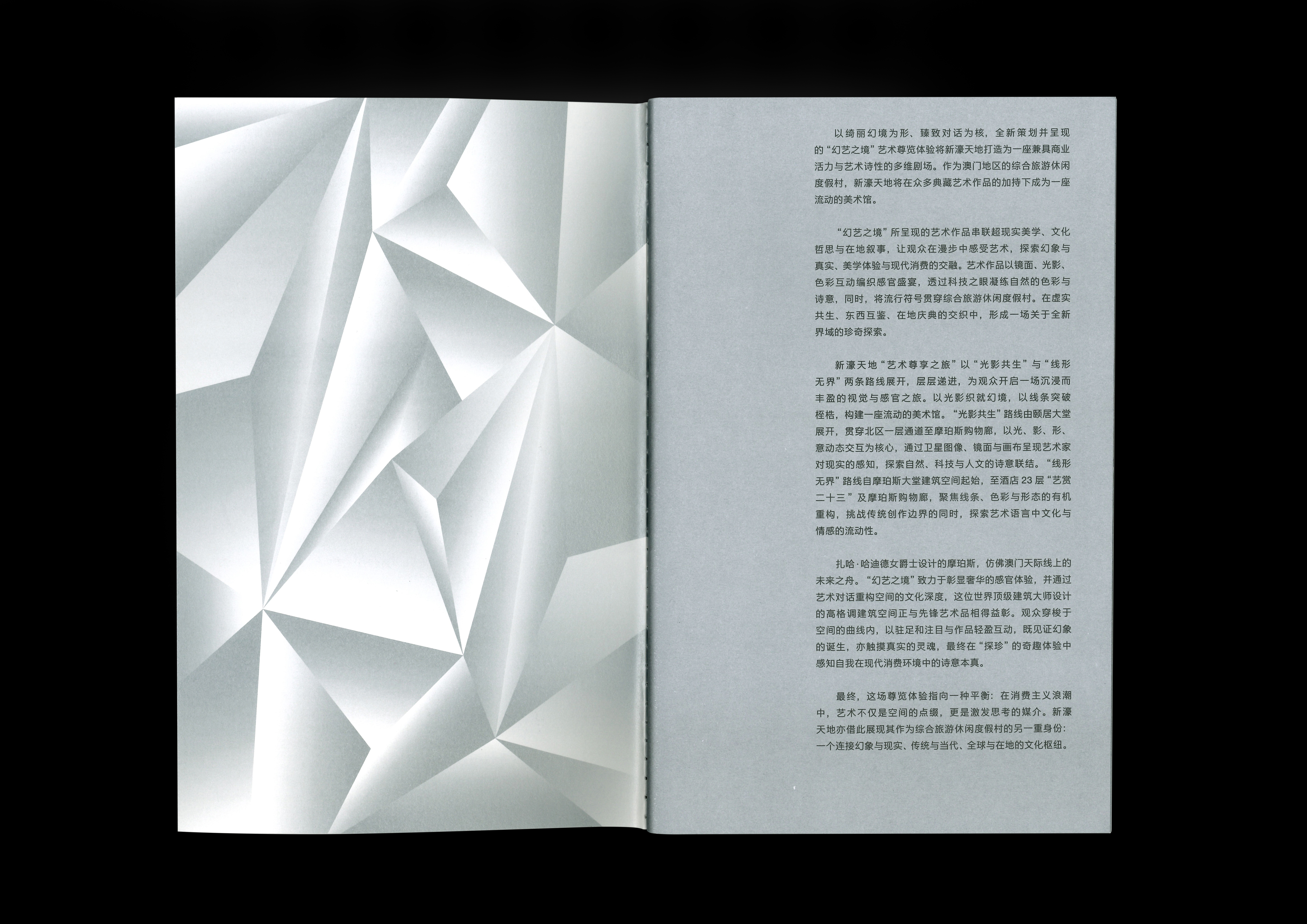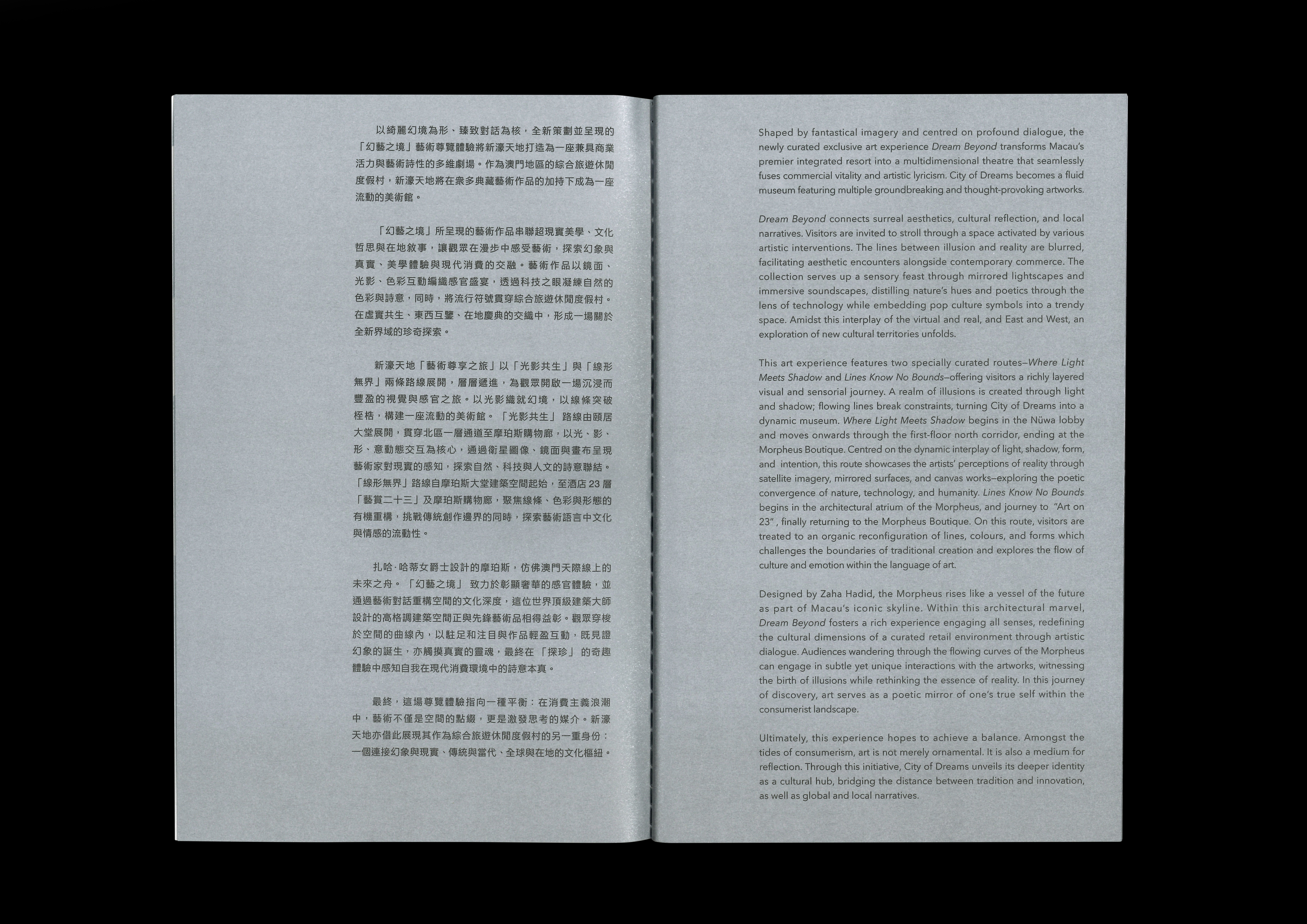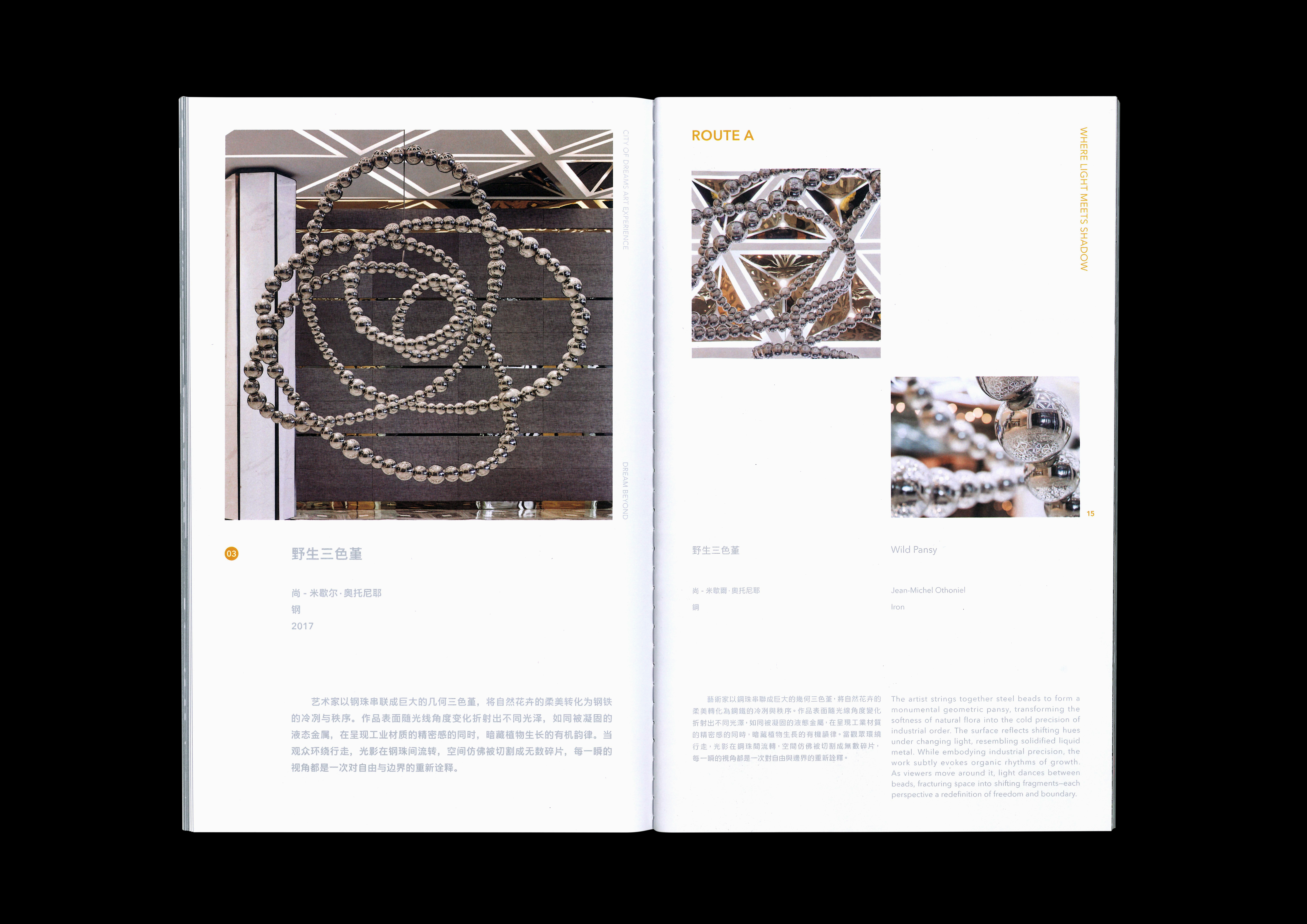 In the design of visual elements, we use the colors "silver" and "triangular facets" throughout the catalogue, echoing the architectural skin and core decorative elements of the interior space of City of Dreams, designed by Zaha Hadid Architects. This also positions the catalogue as a supporting material that serves the space and aligns with its spatial language. In terms of content layout design, we horizontally divided the page into two sections, corresponding one-to-one with the two viewing routes in the curatorial design strategy. Simultaneously, we incorporated a mix of simplified Chinese, traditional Chinese, and English texts. This allows readers to easily distinguish between the artworks along the two viewing routes during the reading process, achieving the goal of functional design generating formal aesthetics.