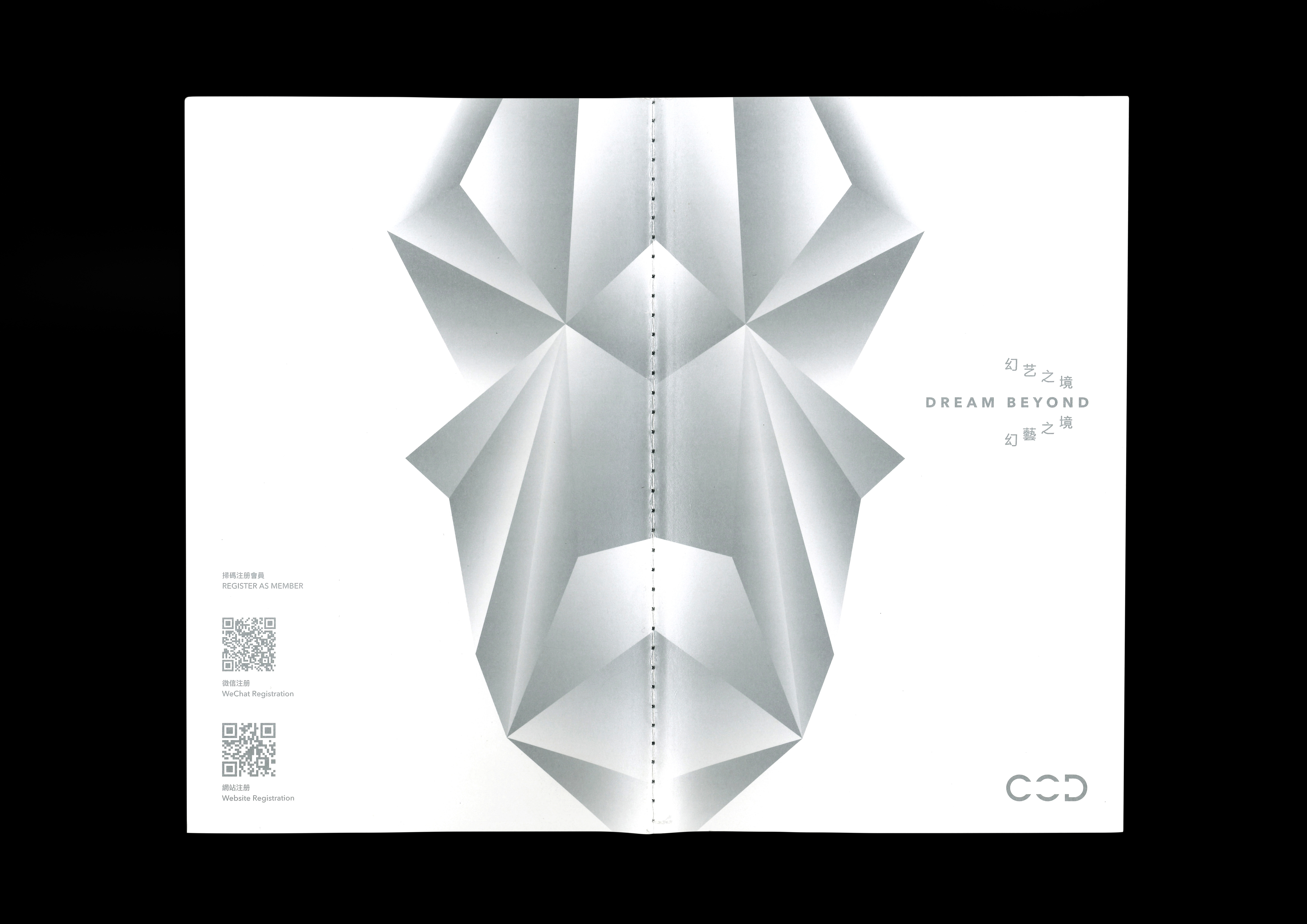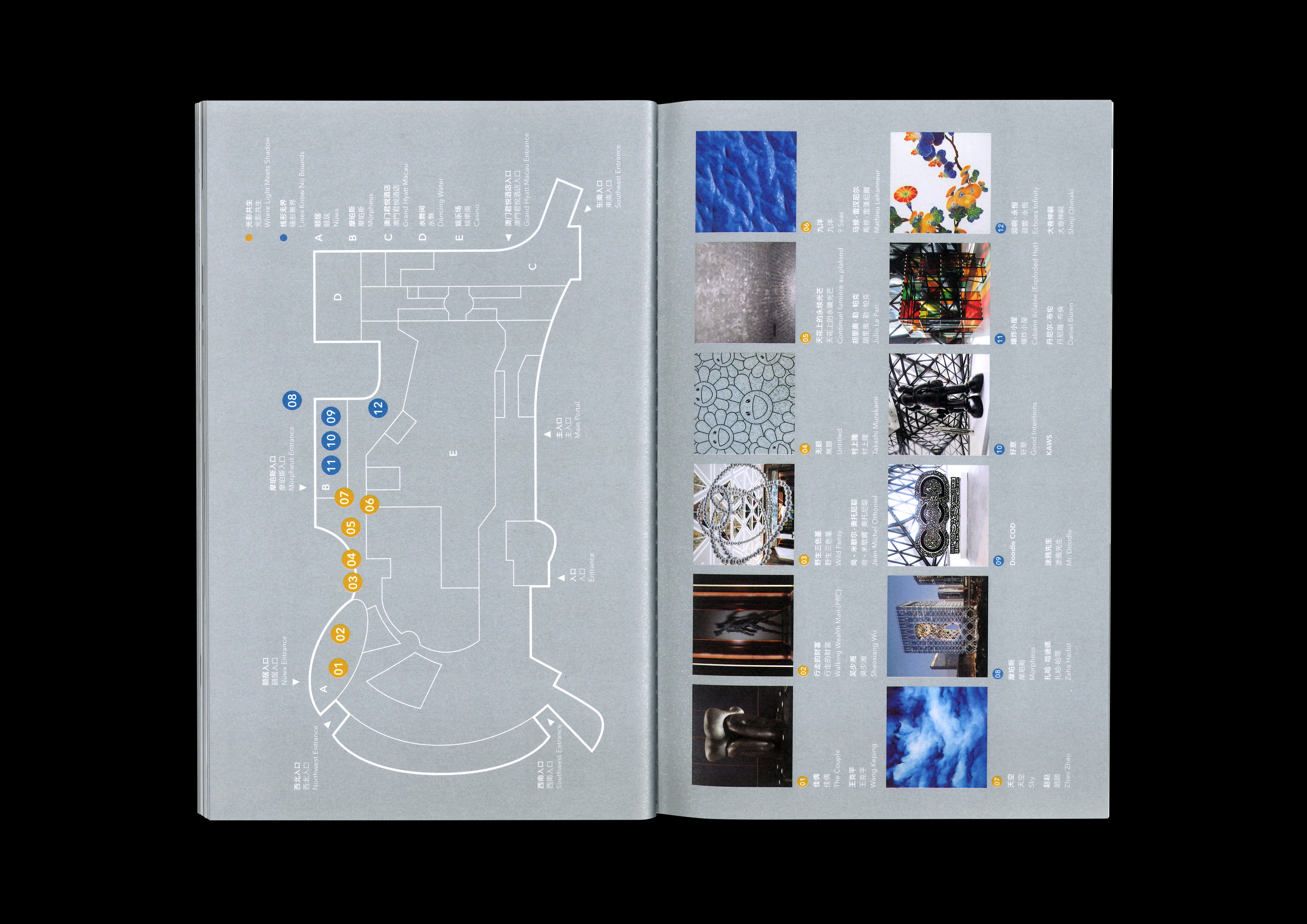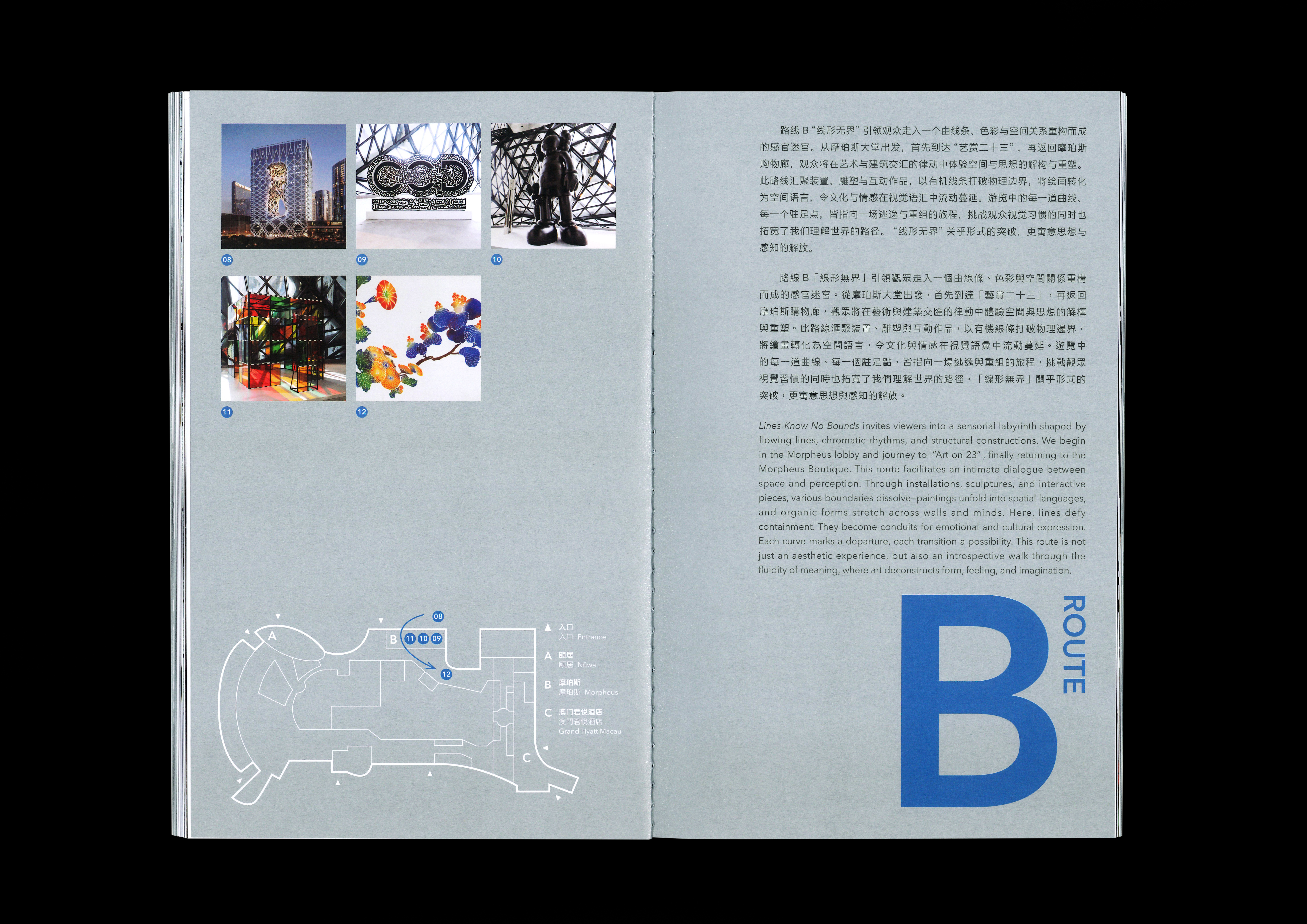 In the design of visual elements, we use the colors "silver" and "triangular facets" throughout the catalogue, echoing the architectural skin and core decorative elements of the interior space of City of Dreams, designed by Zaha Hadid Architects. This also positions the catalogue as a supporting material that serves the space and aligns with its spatial language. In terms of content layout design, we horizontally divided the page into two sections, corresponding one-to-one with the two viewing routes in the curatorial design strategy. Simultaneously, we incorporated a mix of simplified Chinese, traditional Chinese, and English texts. This allows readers to easily distinguish between the artworks along the two viewing routes during the reading process, achieving the goal of functional design generating formal aesthetics.