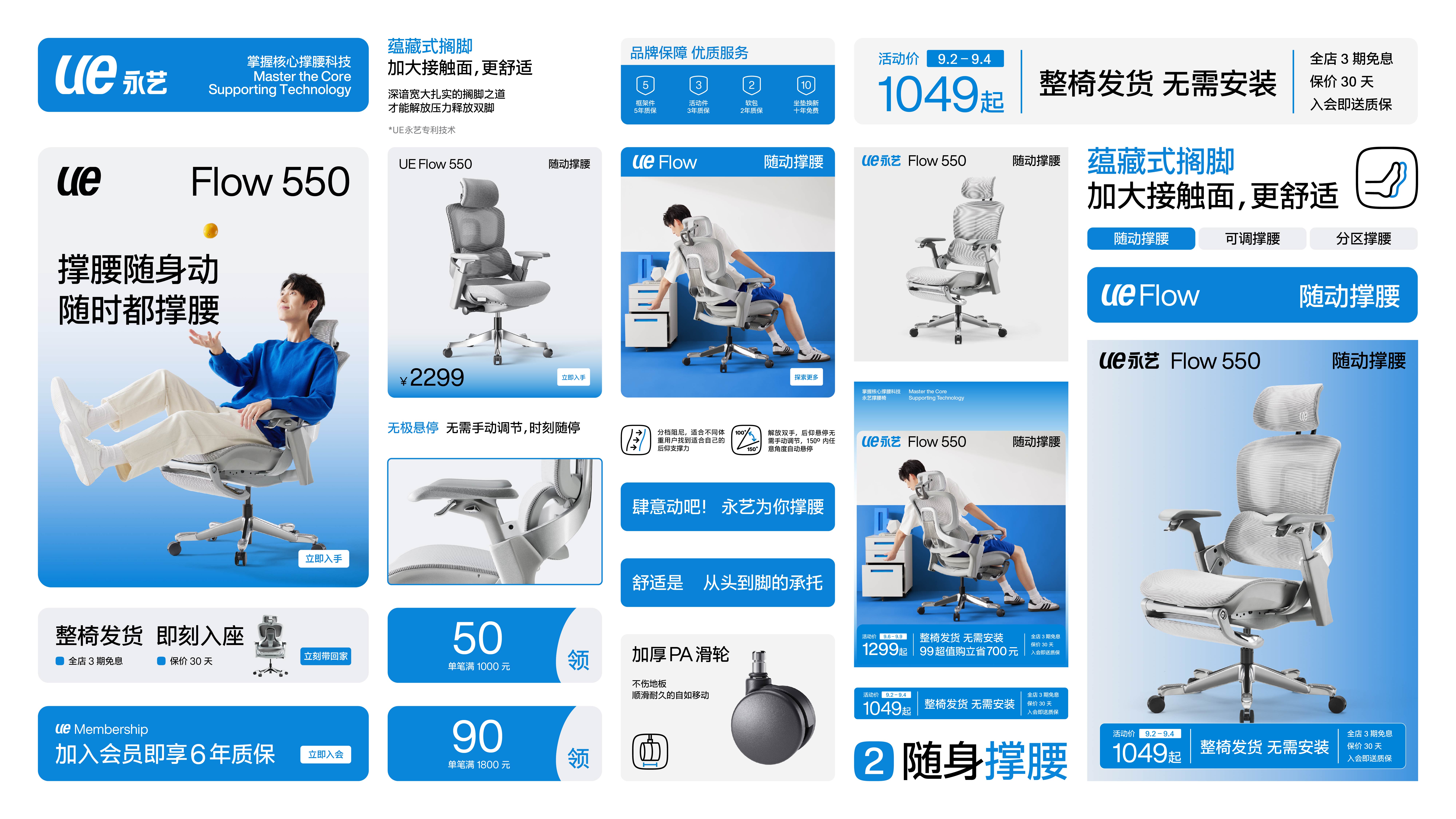 Based on the new definition of brand value, we have reorganized and planned the product line classification for the brand and consumers, so that the user's consumption decision-making can change from choosing a chair to the support required for choosing, allowing the support to further pass product lines convey a unified brand narrative:UE, UE Act, UE Flow, and UE Pro. Help enterprises form a coherent and unified concept and effective output of value from brand to product. At the same time, through product slogan creation, product naming system, copywriting, from brand to product lines and from product lines to products, complex information content is deleted and simplified, effective information is refined, and efficient understanding is promoted.